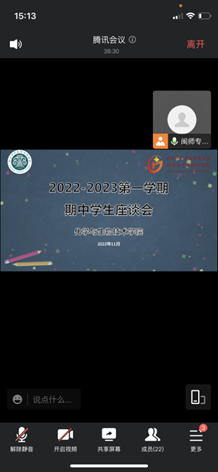 为进一步了解教师线上教学情况和学生学情信息,做好学生评教和教师评学工作,化学与生物技术学院于11月16日通过腾讯会议召开2022-2023第一学期期中学生座谈会,学院院长陈宗保、副院长林媛、副书记张瑛、教研室主任及学生代表参加了本次会议。会议由林媛副院长主持。
