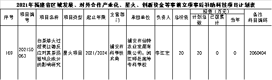 2021年10月11日,从《福建省科学技术厅关于下达2021年区域发展等省级科技项目计划的通知》(闽科资〔2021〕25号)收悉,化学与生物工程系谢勇教授与福安市仙特农业发展有限公司联合申报的星火项目《白茶焙火过程美拉德反应对其茶汤滋味及成分的影响研究》(2021S0063)喜获立项,项目资助经费10万元。这项突破有助于提高校企合作水平,对我系科研实力的整体提升将起到重要的推动作用。