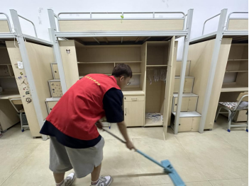 活动一:新生宿舍清扫活动。志愿者提前了解新生宿舍分布情况,整理宿舍床铺、书桌、衣柜等个人区域,清洗宿舍走廊、楼梯、大厅、厕所等公共区域。清扫后,志愿者认真检查宿舍各个区域进卫生,排查宿舍设备是否损坏,确保新生舒适入住。