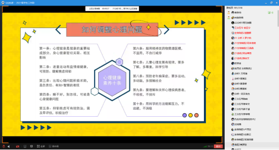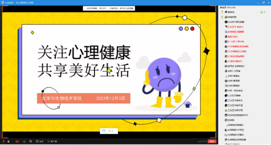 为加强学生的心理健康教育,培育理性平和的健康心态,提高心理素质,2023年12月3日,化学与生物技术学院线上开展了“关注心理健康 享受美好生活”主题班会。