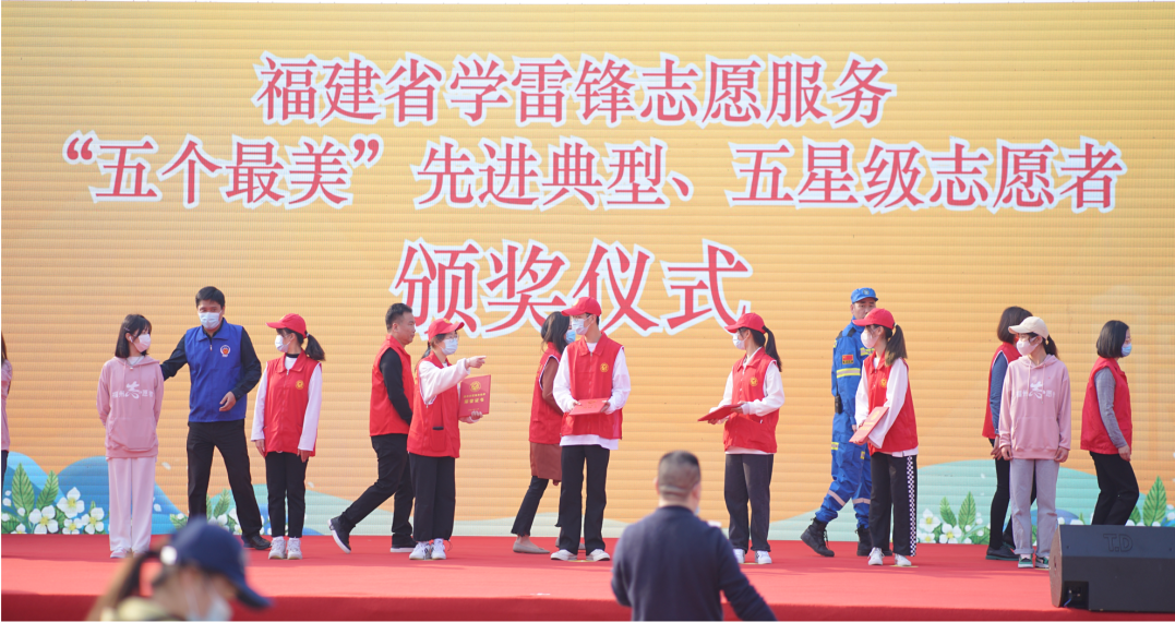 嘉宾们为福建省学雷锋志愿服务先进典型、五星级志愿者和福建省志愿服务项目大赛获奖项目代表颁奖,为福州市首批“长者食堂”共建单位及福州市新时代文明实践首批示范阵地等颁发了证书和牌匾。化学与生物技术学院的志愿者们协助颁奖授牌仪式的顺利进行。