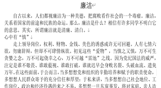 在活动中,同学们围绕“廉洁心语”主题,结合思想、工作、学习、生活实际,进行诗歌、散文、随笔、信件等文字撰写,共收到29份作品。在这样一篇篇文章中,我们仿佛与那些坚守廉政初心的反贪斗士们进行了深切的交谈,正如同学们写道“心静才能持久,轻囊方能远行。”可以看出同学们对反腐败斗争的坚定信心与对廉洁的一致追求。廉洁奉公永远是人民的期盼,勿以廉小而不为,勿以利小而贪之,只有将廉洁深入人心,以心化形,才能通过行动生动体现。