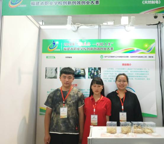 2018年6月8日-10日,化工系创新创业“天然制皂”项目团队16级叶滢绮、17级李泽俊、吴州花及指导老师黄昌兴一行四人在校团委的组织下前往泉州参加由黎明职业大学举办的2018年“挑战杯—彩虹人生”福建省职业学校创新创效创业大赛终审决赛。
