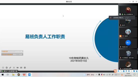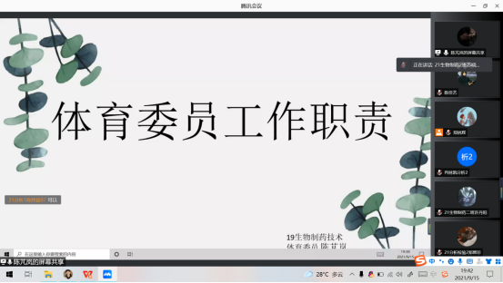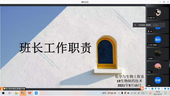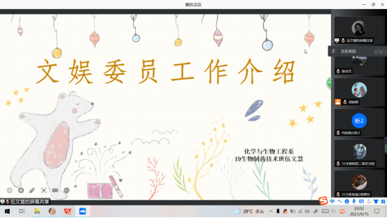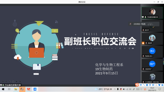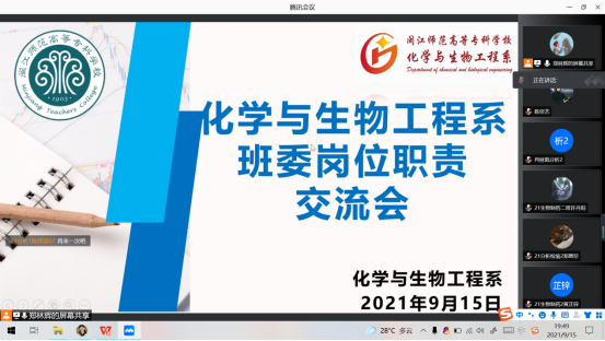 为加深新生对班级班委岗位职责的了解,同时引导同学们对竞选班委的热情,2021年9月15日,化学与生物工程系召开了新老生班委岗位职责线上推介会。
