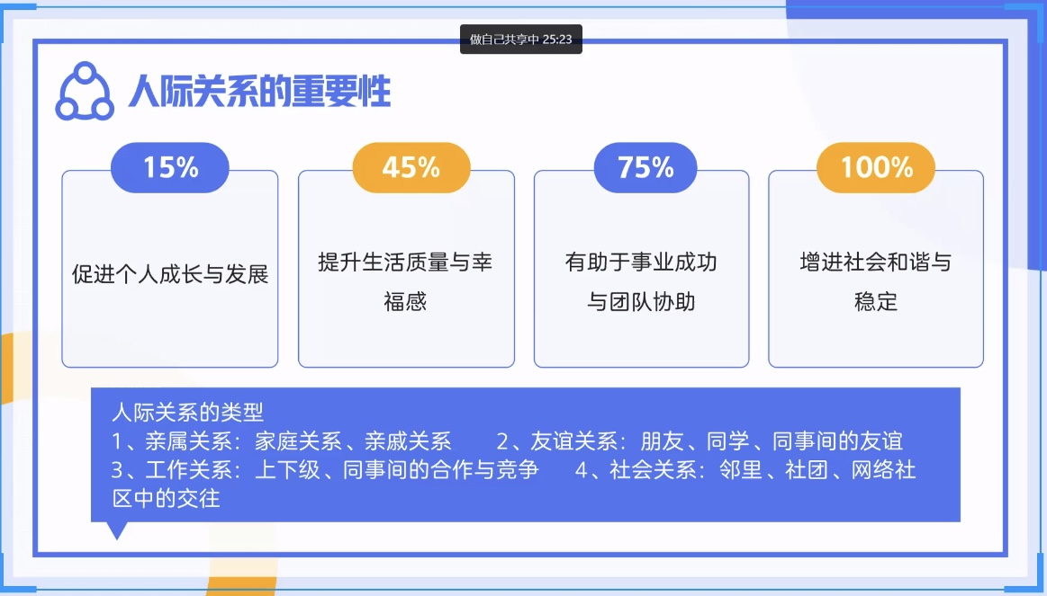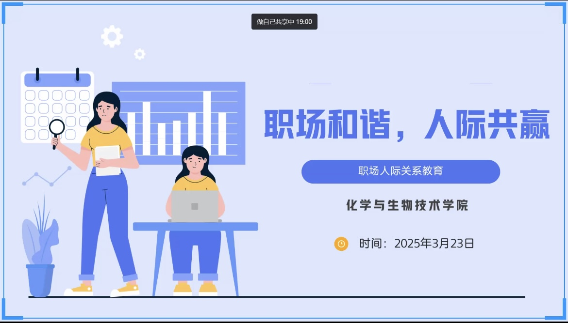 为帮助同学们深入了解职场人际关系的重要性,掌握有效沟通与人际交往技巧,奠定未来职业发展基础。化学与生物技术学院于2025年3月23日在线上开展了以“职场和谐,人际共赢”为主题的班会。