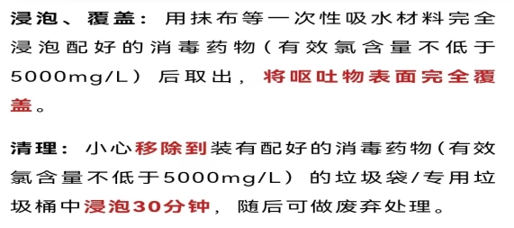 用呕吐包内的消毒干巾覆盖包裹呕吐物,作用30分钟后,将覆盖了消毒干巾的呕吐物丢入垃圾袋/垃圾桶(不用浸泡消毒液)。