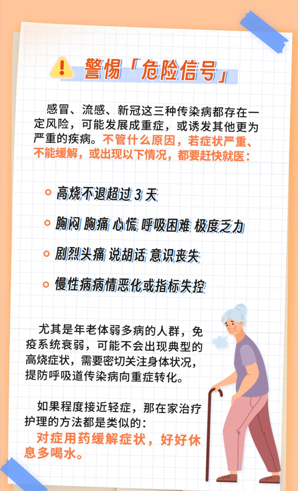 4、注意识别重症病例:流感也可能引起严重的并发症,如果出现以下症状,请及时去医院就医,避免错过最佳治疗时间。① 持续高热超过3天,伴有剧烈咳嗽,咳脓痰、血痰,或胸痛。② 呼吸频率快,呼吸困难,口唇紫绀。③ 出现反应迟钝、嗜睡、躁动、抽搐等神经异常。④ 严重呕吐、腹泻,出现脱水表现。⑤ 合并肺炎。⑥ 原有基础疾病明显加重。