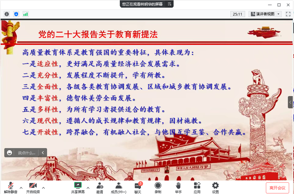 林明华书记对党的二十大报告中关于教育的内容进行了梳理,通过党的十八大、十九大报告对比,指出党的二十大报告将有关教育、科技、人才的内容独立成章。这充分体现了党中央重视教育在社会主义现代化国家建设全局中的地位和作用 ,更高定位了科教兴国战略地位。