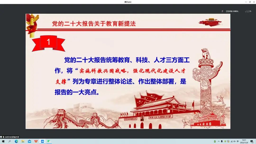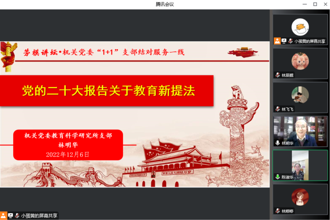12月6日下午,教育科学研究所党支部与附小党总支开展党课共建活动。市劳模,特级教师,教育科学研究所党支部书记林明华为附小和教科所全体党员开设在线专题党课——《党的二十大报告关于教育新提法》。