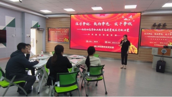 5月23日下午,教务处党支部书记葛思华为支部党员讲授了“深学争优、敢为争先、实干争效——为推动高等职业教育高质量发展贡献力量”的作风建设专题党课。
