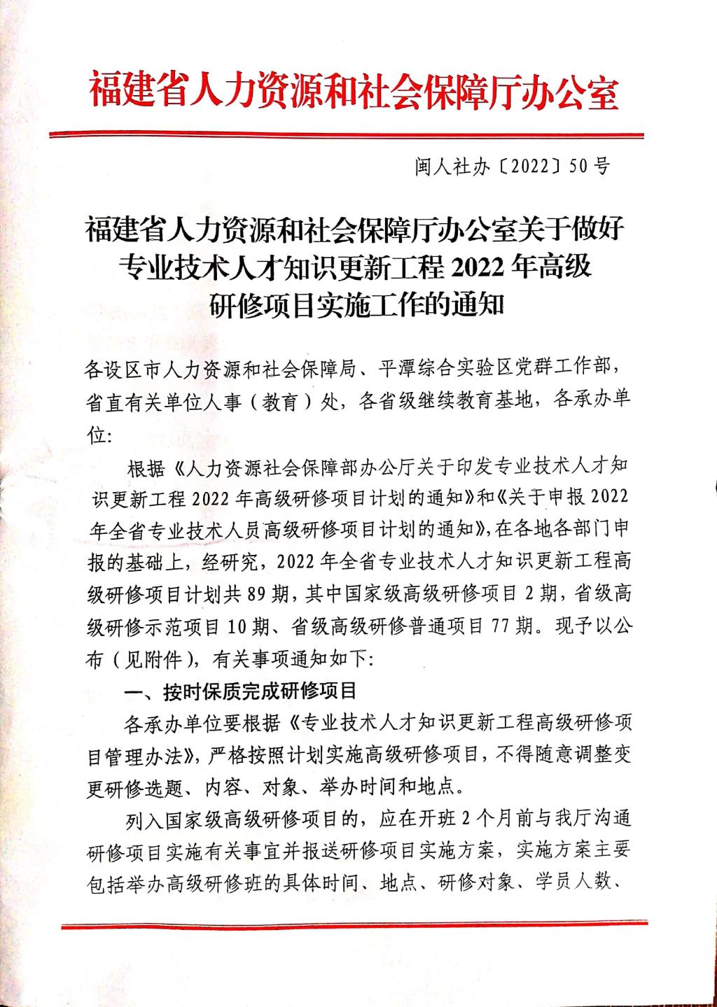 近日,福建省人力资源和社会保障厅办公室公布了《关于做好专业技术人才知识更新工程2022年高级研修项目实施工作的通知》(闽人社办〔2022〕50号)。根据《通知》,2022年全省专业技术人才知识更新工程高级研修项目计划共89期,其中国家级高级研修项目2期,省级项目87期。大赢家体育app下载申报的《长乐区中小幼专兼职责任督学高级研修班》等4个项目已获批省级项目。