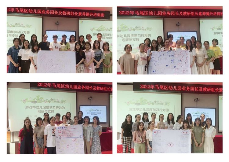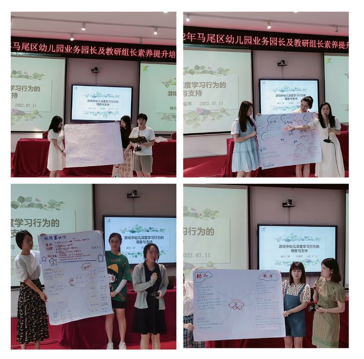 后半场,吴园长带领学员们分小组开展工作坊活动。各组成员在组长的组织下分享各自教学实践中的幼儿深度学习案例。随后,各组围绕吴园长提供的视频案例《建构游戏:立交桥》,迁移运用讲座中学习到的幼儿深度学习的特征和教师支持的策略两项核心要素,从幼儿、教师和环境的不同角度,有效讨论并分析了视频案例中幼儿的深度学习行为和教师的支持回应策略,达成共识形成思维导图,并由各组代表进行分享交流。