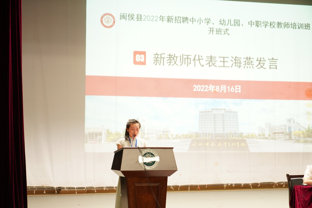 闽侯县教师进修学校附属中学王海燕老师作为新教师代表发言,她回忆了参加教师招聘过程中的苦与乐,并从教书育人、为人师表、终身学习三个角度分享了新教师对未来工作与生活寄予的美好憧憬。