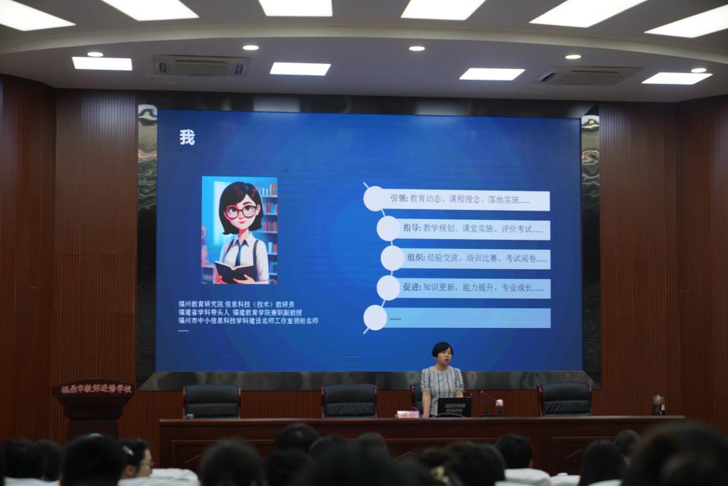 8月21日上午,福州教育研究院信息技术学科教研员、福建省学科教学带头人、福州市中学信息科技学科建设名师工作室领衔名师、福建省基础教育信息化专家库专家林昉老师为新教师做专题讲座。她向大家展示了课堂数字化的典型案例,发起了“信息时代教师应具备的基本信息素养?”等问题互动,引发各参训教师的深刻思考和积极讨论。她也给学员们分享了各类优质的数智资源,建议大家用好国家中小学智慧教育平台,在日常教学中有效常态化应用,以提升自身的业务能力和教学水平,为学生创造更好的数智化学习体验。