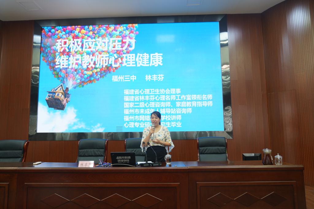 8月22日上午,福州三中一级教师、福建省心理名师工作室领衔名师林丰芬老师从心理学角度向新教师们解析即将面临的压力是什么、从何而来及如何应对。学员们通过参与讲座中的趣味活动,更加直观地感受压力的存在,并尝试着面对、缓解。她希望大家在工作中要注重自我调节,合理规划工作和休息时间,以更健康的心态从事教育教学活动。