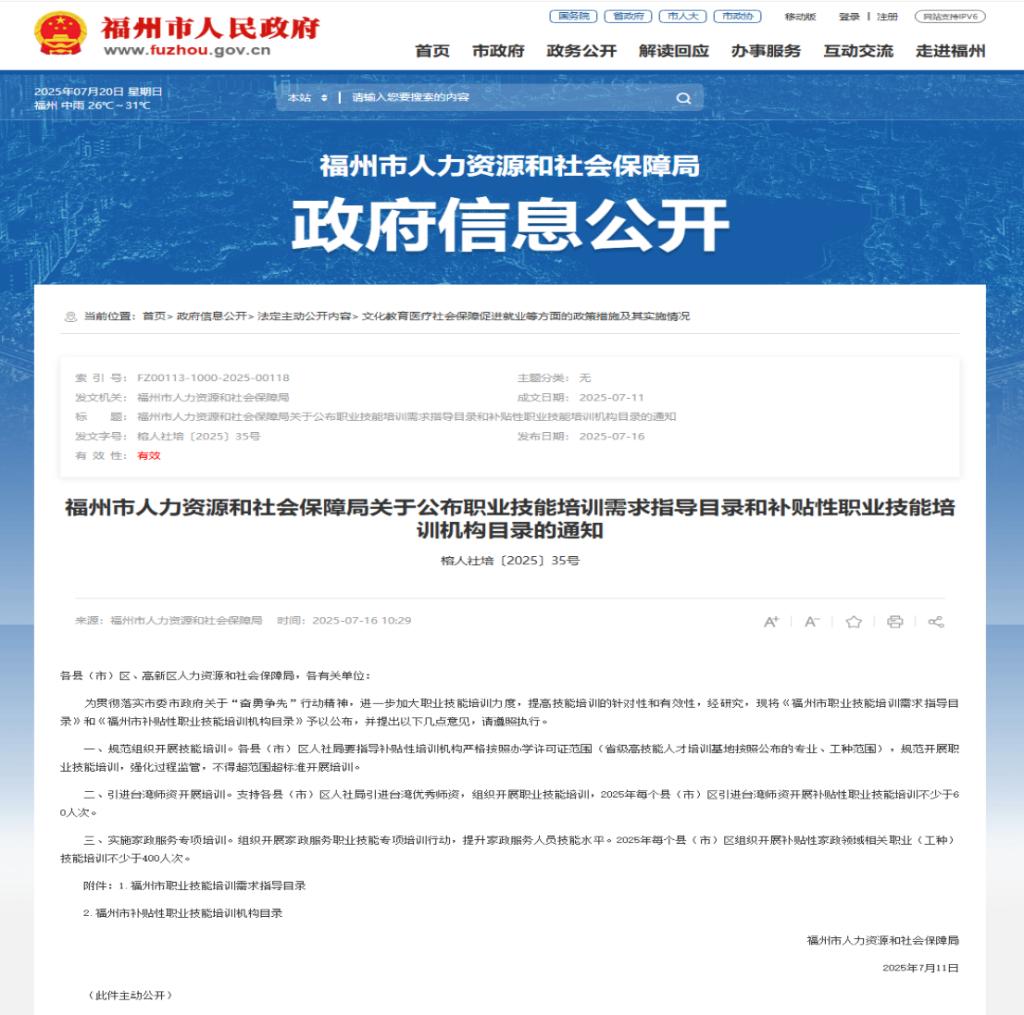 福州市为全面贯彻落实《福建省职业技能提升工程为民办实事项目实施方案》(闽人社文〔2024〕41号)文件和《福建省人力资源和社会保障厅印发关于进一步规范职业技能培训管理工作八条措施的通知》(闽人社发〔2024〕2号)文件精神,面向社会公开征集培训工种和培训机构,旨在进一步提高职业技能培训的针对性和实效性,充分发挥职业技能培训促进就业和推动产业发展的作用。