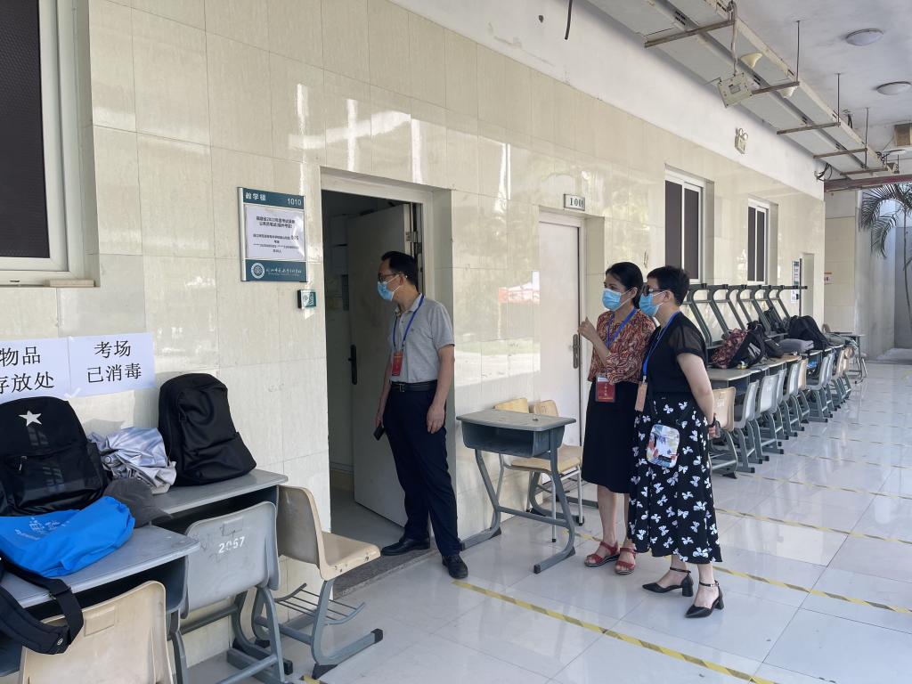 考试当天考务负责人对监考人员进行考前集中培训,对本次考试的注意事项等内容进行再一次强调。另外安排医护及工作人员团队在校门口做好进校人员的体温检测、查验核酸检测报告单、绿码以及身份验证等工作。同时考场区还准备了隔离考室,并要求考生进入考场后立即使用免洗洗手液进行手部消毒。公安、医护等团队做好全程后勤保障,以便考试过程发生突发状况能够给予及时解决。