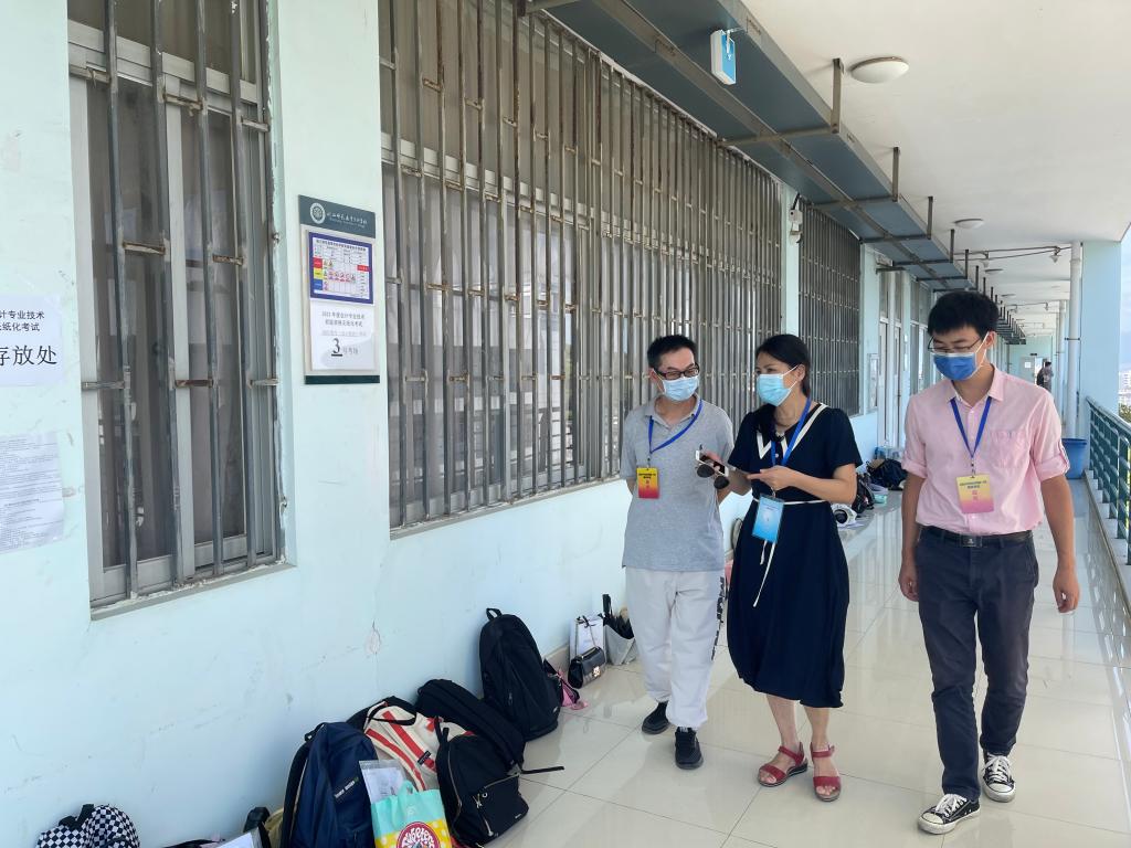 考试当天考务负责人对监考人员进行考前集中培训,对本次考试的注意事项等内容进行再一次强调。另外安排医护及工作人员团队在校门口做好进校人员的体温检测、查验核酸检测报告单、绿码以及身份验证等工作。同时考场区还准备了隔离考室,并要求考生进入考场后立即使用免洗洗手液进行手部消毒。交警、医护等团队做好全程后勤保障,以便考试过程发生突发状况能够给予及时解决。