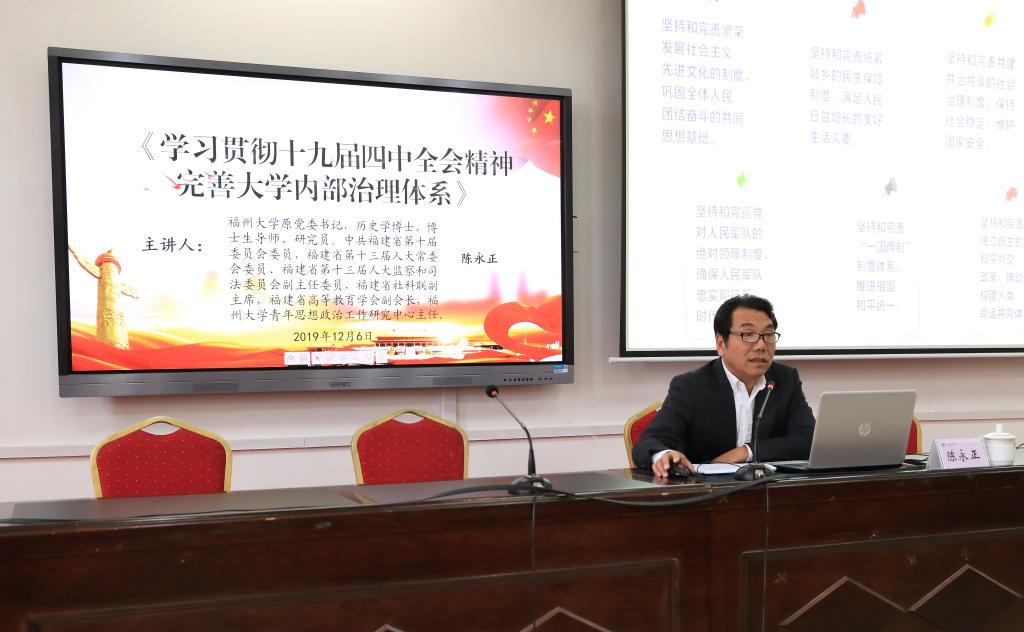 12月6日下午,大赢家体育app下载特邀福州大学原党委书记陈永正研究员来校作《学习贯彻十九届四中全会精神 完善大学内部治理体系》专题讲座。校党委书记陈荣生,校长林贤、党委副书记陈新、副校长黄耀荣、张兰、林旻及全体副科级以上干部、教研室主任、教务处、科研处、学生处教师代表等共计100余人参加讲座。讲座由党委书记陈荣生主持。