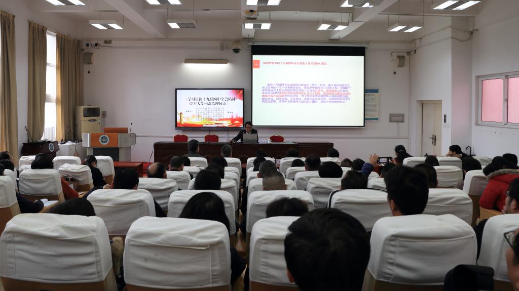 党委书记陈荣生在主持中指出,陈永正研究员的讲座站位高、站位实,为我们系统、全面地阐述了党的十九届四中全会的重大意义和核心要义,分析了5个创新点,结合全会精神对高等教育提出的要求,对如何进一步实现高校高质量内涵式发展提出了深刻、生动的指导。讲座内容丰富,思想性和针对性强,对学校在实际工作中进一步贯彻全会精神,提升办学治校各项能力水平,加快推进学校治理体系和治理能力现代化具有很好的指导意义。陈荣生书记强调,当前,学校正处于改革发展的重要时期,要认真学习、深刻领会全会精神,进一步激发工作责任感、使命感、紧迫感和荣誉感,破解发展中的重点、难题,科学、稳健推进学校内涵建设,实现学校高质量、特色发展。