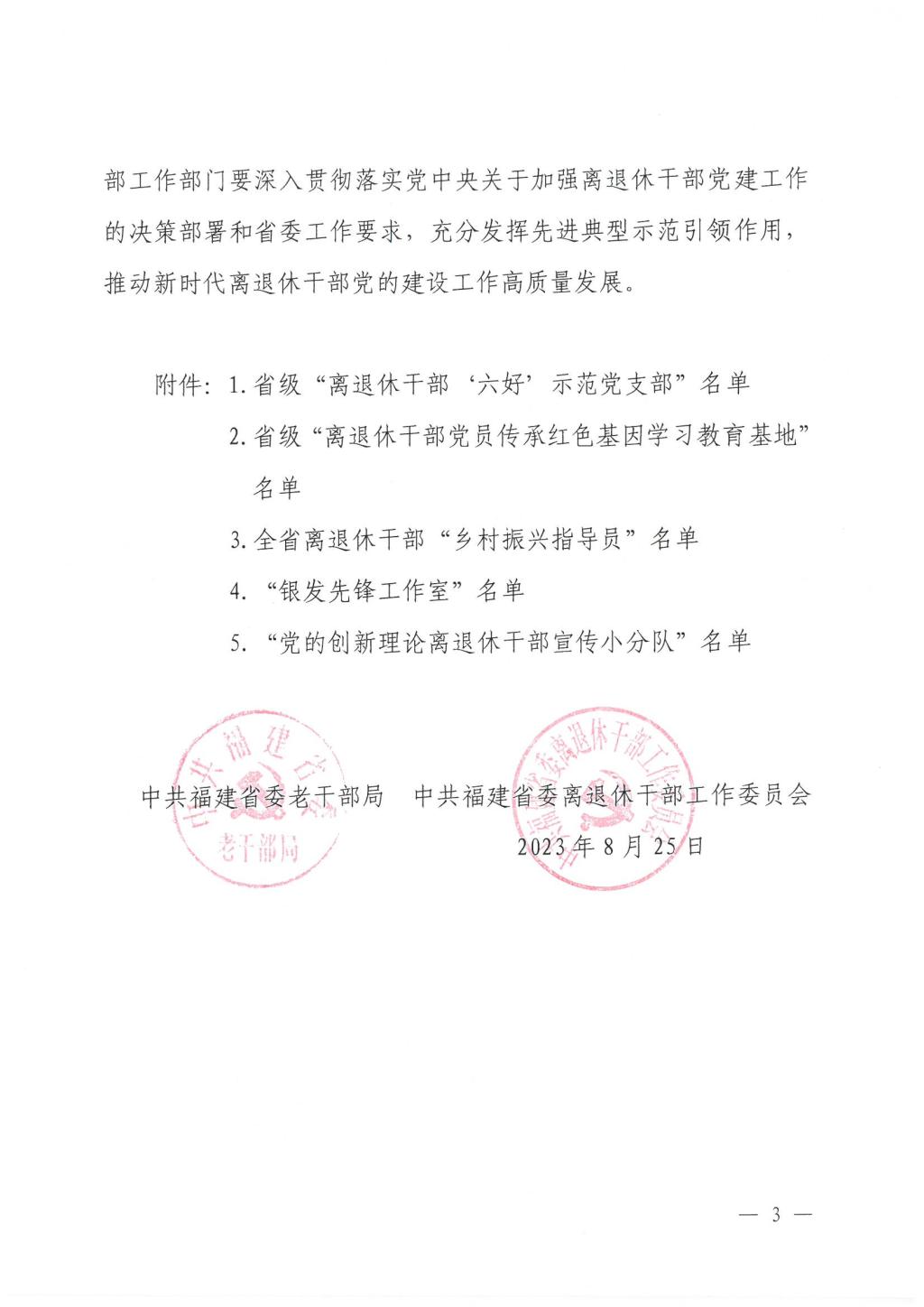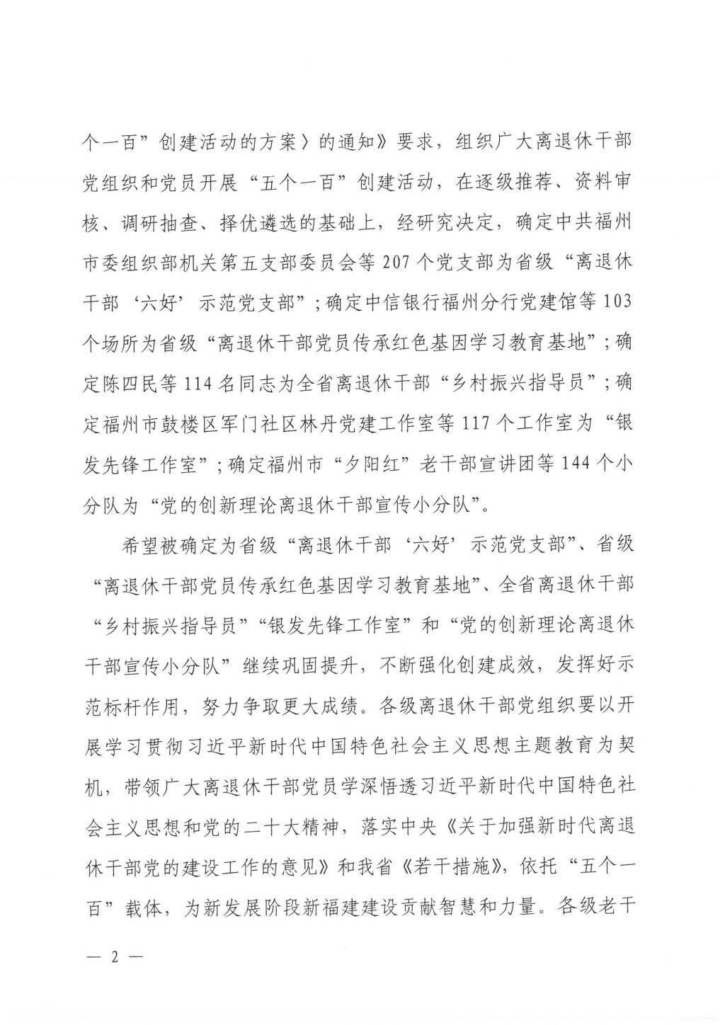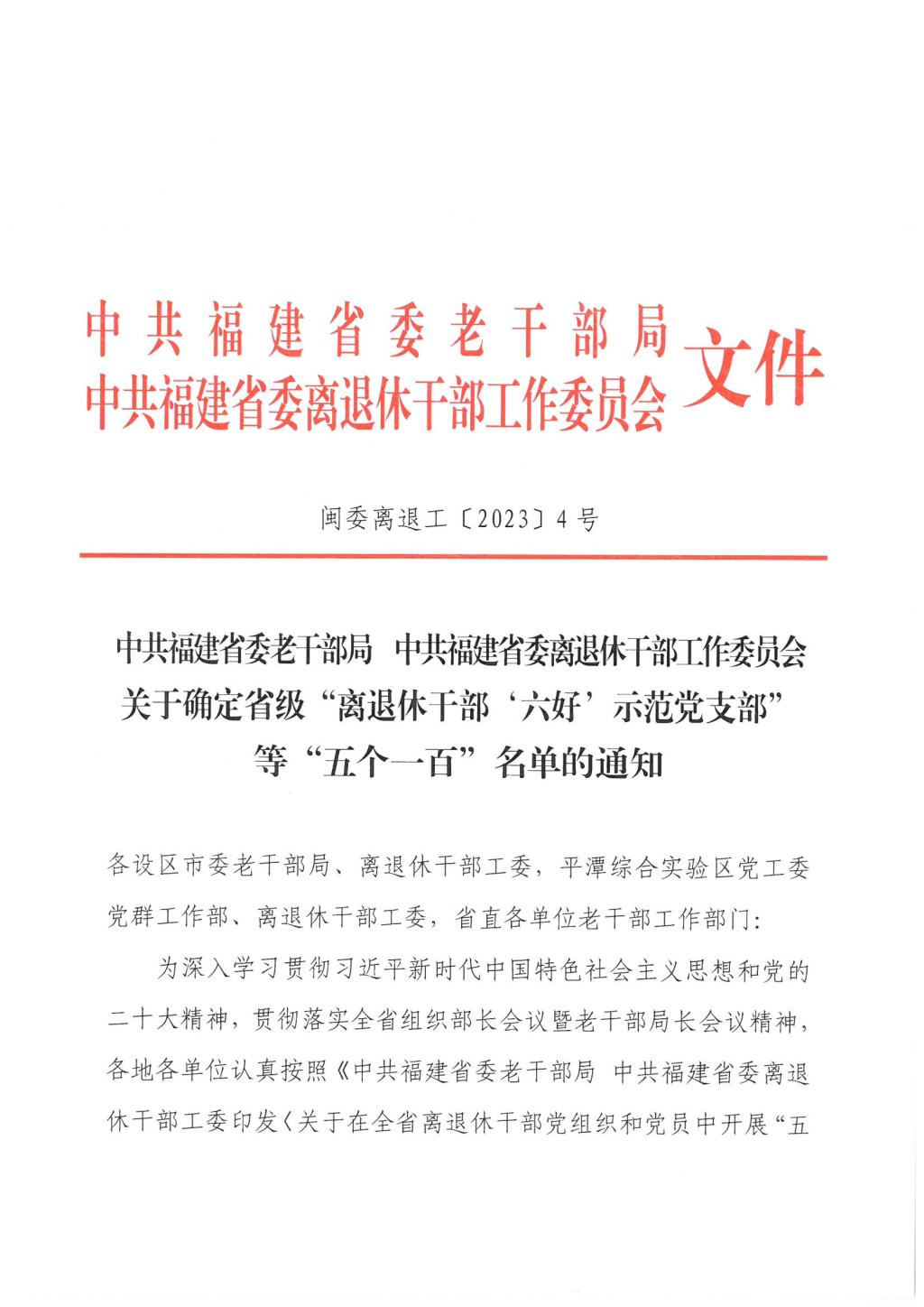 近日,中共福建省委老干部局、中共福建省委离退休干部工作委员会印发《关于确定省级“离退休干部‘六好’示范党支部”等“五个一百”名单的通知》(闽委离退工〔2023〕4号),大赢家体育app下载离退休第一党支部获评省级“离退休干部‘六好’示范党支部。