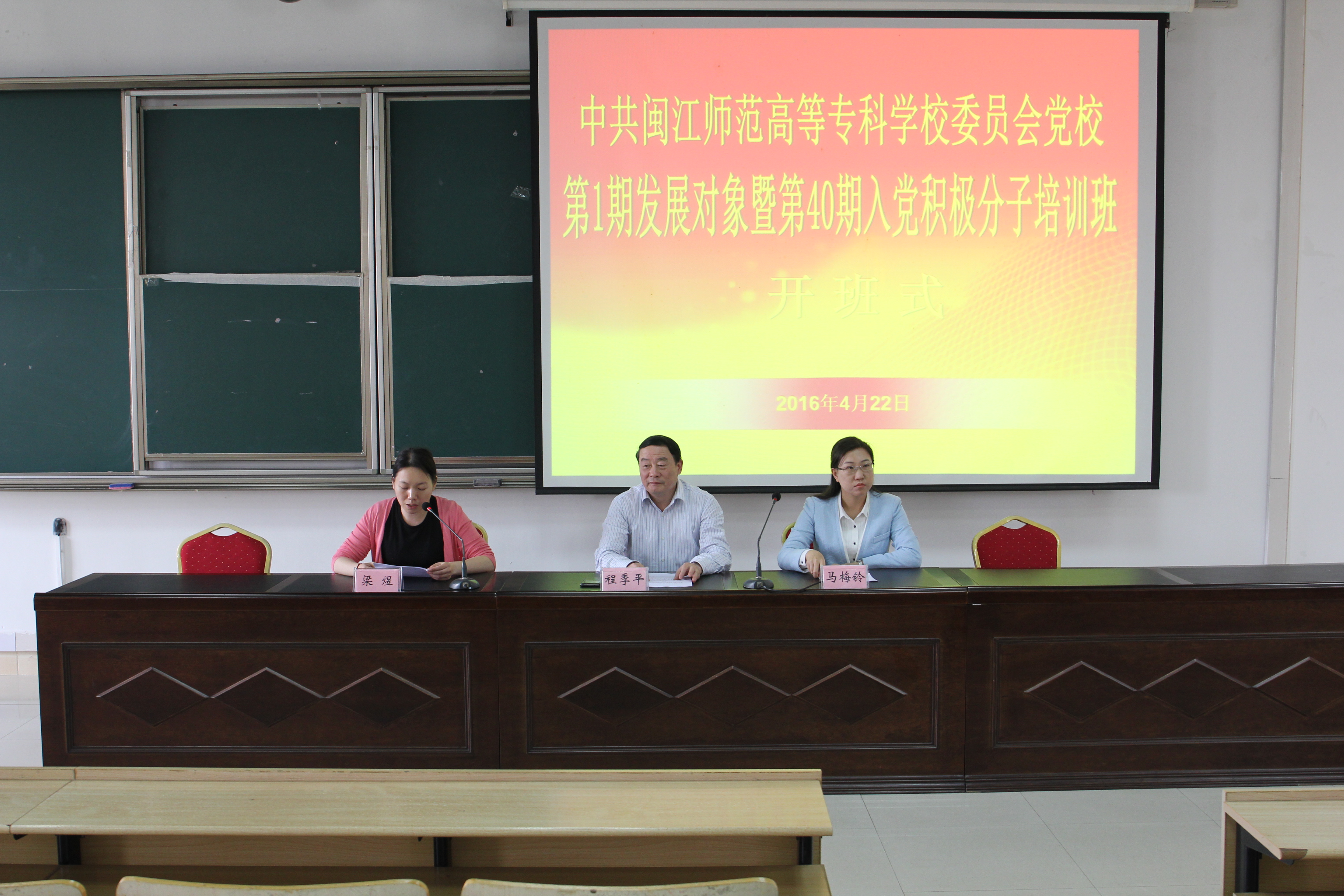 2016年4月22日下午,校党校于旗山校区教学楼举行第一期发展对象培训班暨第四十期入党积极分子培训班开班仪式。校党委委员、副校长程季平,校党校副校长、党工部副部长马梅铃及全体学员参加了开班式。