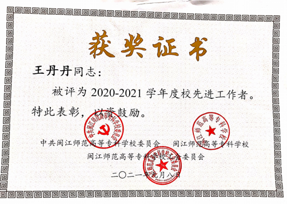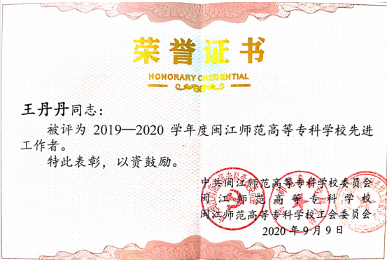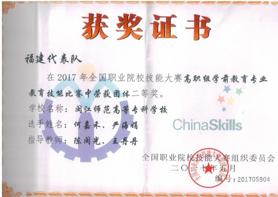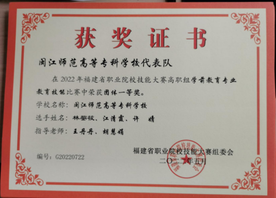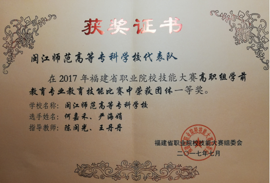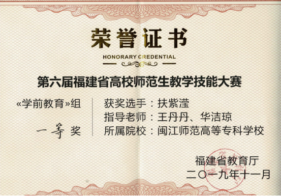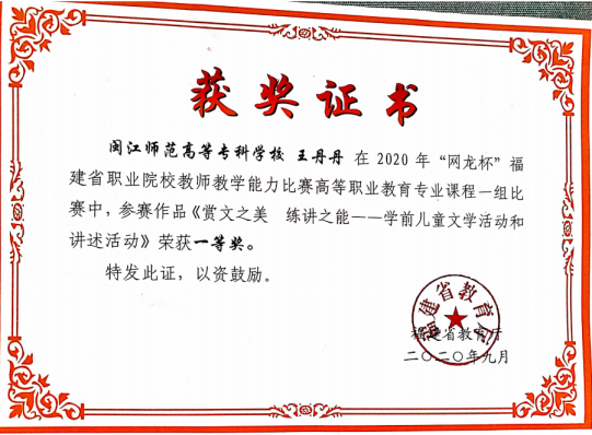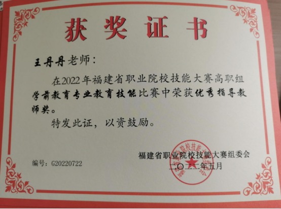 任教九年来,她成为闽师专学前教育学院教学团队的骨干教师,承担学前儿童语言教育、家庭教育、幼儿园课程等课程教学工作。认真履行教书育人之根本职责,坚持课程教学持续改进,不断创新的工作原则,刻苦钻研教材和课程资料,结合课程特点,不断在教学中引入新素材,设计新方案,努力提高教学效果和自身教学水平。先后发表学术论文10余篇,参编教材5部,获得校首届冰心教育奖,多次获得校先进教育工作者等荣誉;主持2019年第四批福建省职业教育精品在线开放课程《学前儿童语言教育》项目建设;2020年参加福建省职业院校教师教学能力比赛荣获一等奖;指导学生参加全国职业院校技能大赛学前专业比赛荣获团体二等奖1次、福建省职业院校技能大赛学前专业比赛荣获团体一等奖2次,并获得“优秀指导教师”称号;指导学生参加福建省高校师范生教学技能大赛荣获一等奖1次、二等奖1次。