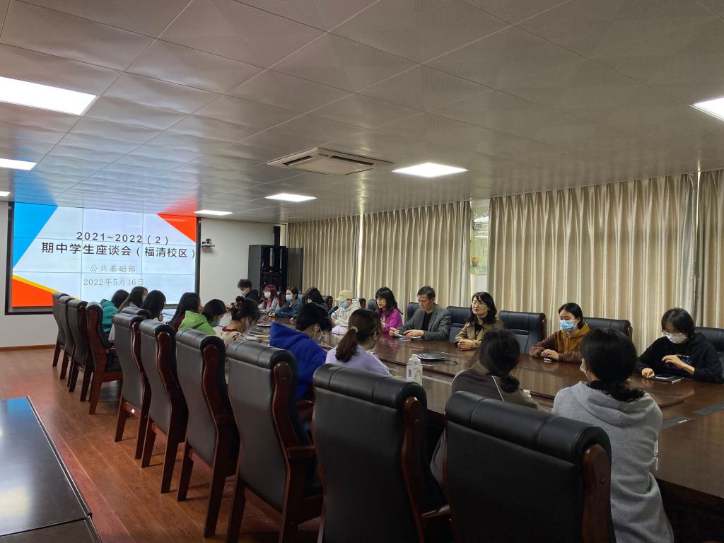 为加强对教育教学质量的监控,广泛收集学生对教学工作的反馈意见,提高教学管理水平,公共基础部分别于2022年5月16日、5月19日在福清、旗山两校区组织召开期中学生评教座谈会。座谈会由公共基础部副主任黄昌兴主持,创新创业教研室主任王宏、专任教师范瑜楠以及2021级、2020级学生代表参加。