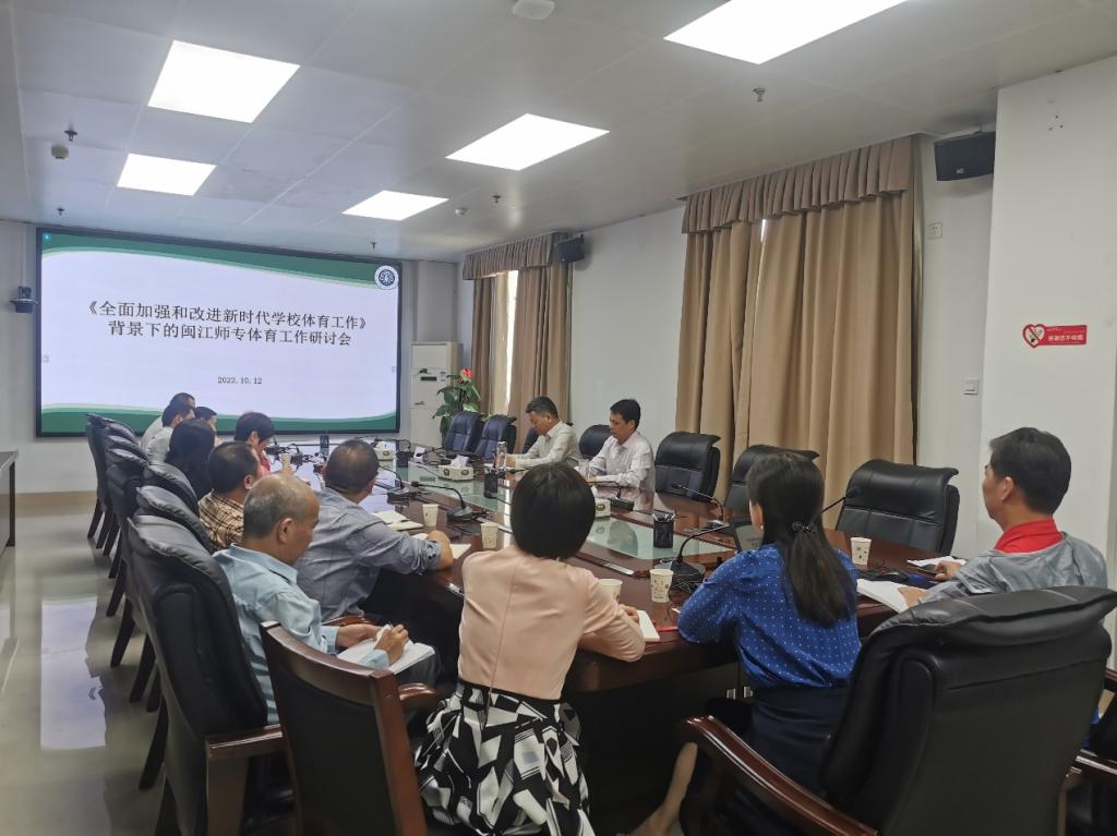 2022年10月12日,闽江师专第一次体育工作研讨会在旗山校区九楼第一会议室召开,校党委书记陈荣生、校长杨建义、校党委副书记林旻以及各二级学院的党总支书记、学生处和团委负责人出席此次会议,会议由教务处主任葛思华主持。