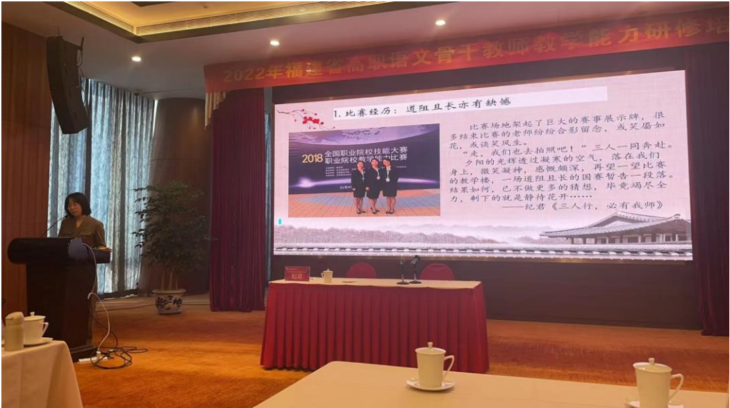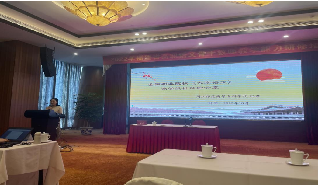 2022年10 月 24 日上午8:30,大赢家体育app下载公共基础部语文教研组纪君老师在福州福清融侨酒店会议厅为2022年福建省高职语文骨干教师能力研修国培班学员带来了题为“全国职业院校教学设计经验分享”的精彩讲座。讲座由福建技术师范学院黄海燕老师主持。纪君老师主要从“全国职业院校技能大赛教学能力比赛”国赛经验及备赛策略、国赛视域下《大学语文》教学设计思考和国赛反思三个角度进行剖析,学员们受益匪浅。