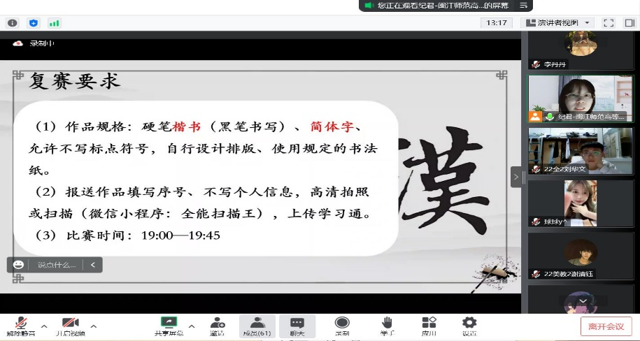本次活动分为初赛与复赛。自10月20日初赛开始,学生们投入了极大的热情,积极发挥自己的长处,踊跃报名参加。活动初赛共收到硬笔书法作品200余件。经过严格的评选,共有61名同学进入决赛。决赛利用腾讯会议、学习通等软件平台,以线上书写形式进行。11月13日晚7点,学生准时来到线上会议室进行书写,在视频中可以看出选手们凝神执笔,认真书写,显现他们对书法的热爱和比赛的严谨态度。此次比赛共产生3名一等奖,10名二等奖,15名三等奖和若干优秀奖。这次书法比赛不仅展现了学生的雅趣与才学,还增进了学生对书法艺术的深入了解,传承并弘扬中华优秀传统文化,构建中华民族精神家园。