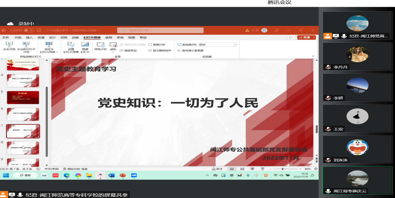2022年11月16日下午四点,公共基础部党支部在腾讯会议上召开党的二十大精神专题学习会议,集体学习贯彻党的二十大精神。会议由支部副书记纪君老师主持。