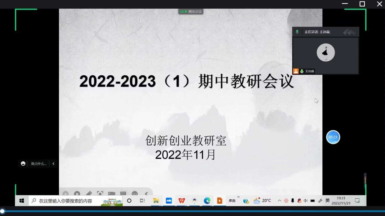 教不停,研不止,共研共进步。2022年11月21日晚,公共基础部创新创业教研室全体专兼任教师齐聚腾讯会议,召开期中线上工作会议,创新创业教研室主任王宏老师主持会议。本次会议主要落实学期初布置的各项准备工作,并对期末各项工作进行具体布置。