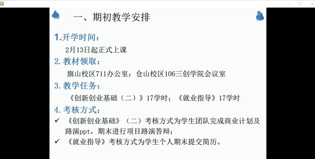 为保证新学期教学工作的顺利开展和教学秩序的正常运行,做好跨校区师资管理,提升授课质量,明确教学规范,2月8日下午3点30分,创新创业教研室在腾讯会议开展2022-2023第二学期福清校区期初教研会议,公共基础部副主任黄昌兴、教研室主任王宏及本学期承担福清校区教学任务的医护学院教师参会。