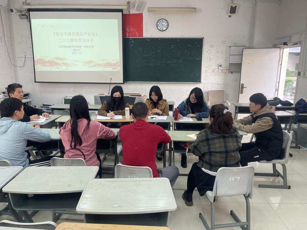 2023年3月8日下午14时,公共基础部党支部于旗山校区1001教室开展第一季度党课学习。支部书记薛庆云同志带领所有党员一起学习党的二十大报告《坚定不移全面从严治党》,并分享自己的学习心得。