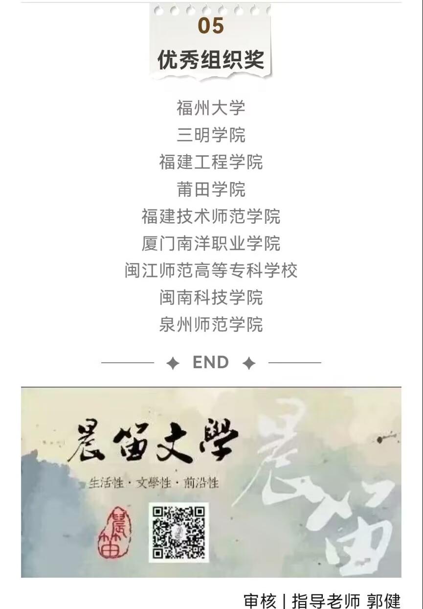 据悉,本次大赛由福建省写作学会主办,福建省文艺理论研究会和闽江学院人文学院联合承办,分诗歌、散文、小说、剧本四个组别,每组题材作品一等奖、二等奖、三等奖数量,分别占该组别作品总数的1%、2%、3%,优秀获奖作品将发表于《福建文学》。本次大赛吸引了全省37所高校学子参与,本科专科混合比赛,竞争十分激烈。比赛分参赛学校初选和组委会终审两个阶段,入围作品由福建省作家协会作家、福建省写作学会专家和省内高校文学教授组成的专家组进行评审。