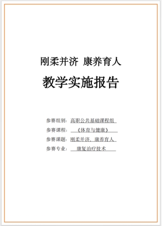 该参赛作品以康复治疗技术专业为背景,以《体育与健康》课程为载体,深度融合“体医融合”教育理念,对“24式太极拳”教学单元进行了系统重构。教学团队以学生为中心,结合智慧教学技术,打造“3E分阶式”教学策略和“三练三修”教学模式,有效提升学生的动作技能、康复素养和文化认同。课程突出“刚柔并济、康养育人”特色,将传统太极文化与康复专业实践有机结合,落实“六融四锤炼”课程思政机制,引导学生实现从“机械模仿”到“形意贯通”、从“被动学习”到“主动创造”的转变,教学成效显著,获得了评委专家的一致认可