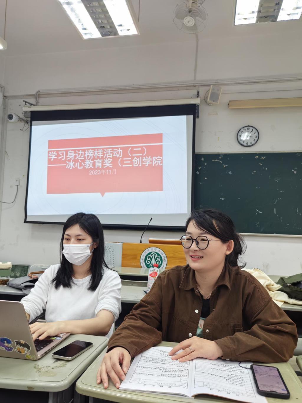 接着,冰心教育奖获奖团队三创学院代表王宏老师向全体党员做了先进事迹汇报,分享了创新创业学院从无到有,从弱到强的奋斗历程,鼓舞全体党员教师实干担当促发展。