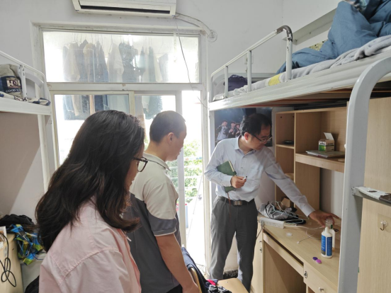 辅导员与主要学生干部细致排查安全隐患,对违规电器使用情况、乱拉电线情况、养宠物和其他违规物品进行全面排查,引导同学们假期离开宿舍要断水断电、锁柜锁门。