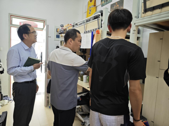 学院领导老师认真查看宿舍安全用电情况、门锁上锁情况、贵重物品保管情况,了解同学们的假期安排和去向情况,提醒同学们要树牢安全防范意识,确保人身财产安全;要合理安排假期生活作息,确保身体心理健康。