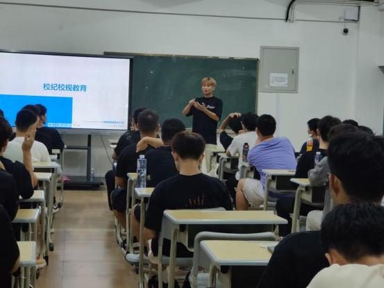 学院自律会会长蔡火旺、宿管部部长倪凯迪详细介绍了学生日常行为规范、宿舍纪律等校规校纪,全面向2024级学生普及校规校纪知识。结合实际案例,对上课纪律、宿舍检查标准、晚查寝、违纪处分等方面作了细致解读,引导全体新生遵守校规校纪、做“有纪律、守规矩”的合格大学生。