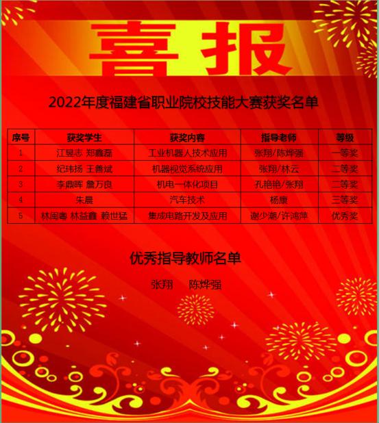 由省教育厅、省人社厅、省财政厅、省农业农村厅、省卫健委、省总工会、团省委、省中华职教社共同举办的2022年度福建省职业院校技能大赛于4月26日圆满落幕。智能制造学院获一等奖1项、二等奖2项、三等奖1项、优秀奖1项,2位教师荣获“优秀指导教师”称号。