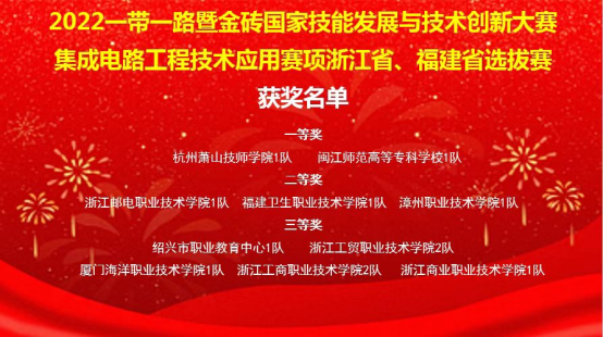 9月18日,2022一带一路暨金砖国家技能发展与技能创新大赛集成电路工程技术应用赛项浙江省、福建省选拔赛在杭州萧山技师学院落幕。由智能制造学院谢少潮、许鸿萍两位老师指导,林益鑫、林志杰和詹贤琨三位同学组成的代表队荣获大赛一等奖。