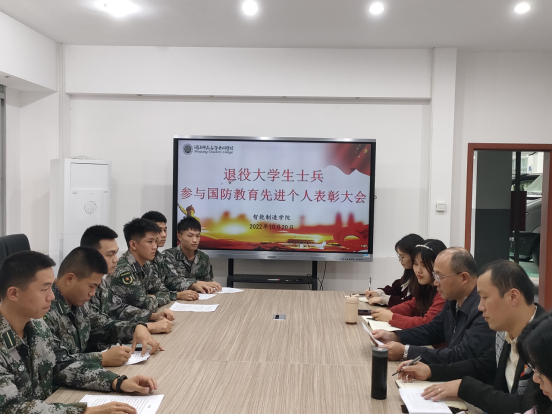 10月20日下午,智能制造学院在17号楼党建会议室召开退役大学生士兵参与国防教育先进个人表彰大会暨参与校园管理专题座谈会。党总支副书记吕志达、副院长陈峰、学生党支部书记张焜、各辅导员和参与国防教育的退役大学生士兵参加会议。会议由团委学生会主席郑程荣主持。