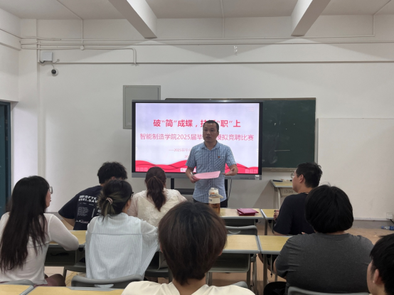 为进一步提升2025届毕业生的就业技能,培养毕业生竞聘能力,8月28日下午,智能制造学院在17-204教室举办“破‘简’成蝶,扶摇‘职’上”毕业生模拟竞聘比赛。
