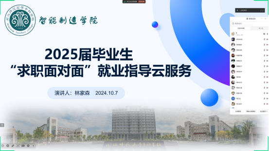为进一步加强对毕业生就业的分类指导和精准帮扶,10月7日晚,智能制造学院组织开展2025届毕业生“求职面对面”就业指导云服务活动(第一期)。活动由毕业班辅导员林家森、魏建辉主讲。