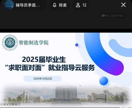 为增强学生职业规划意识,提升就业能力,有效解决毕业生就业问题,切实推进毕业生更加充分、更高质量的就业创业目标,12月22日晚,智能制造学院组织开展2025届毕业生“求职面对面”就业指导云服务活动(第三期)。此次活动由毕业班辅导员主讲,通过线上平台为2025届毕业生们提供直接、实用且富有针对性的就业指导。