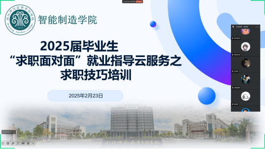 为助力毕业生更好地规划职业生涯,2月23日晚,智能制造学院组织开展2025届毕业生“求职面对面”就业指导云服务活动(第五期)。此次活动由毕业班辅导员张焜、季昌文、魏建辉、林家森主讲,通过线上平台为2025届毕业生提供直接、实用且富有针对性的就业指导。
