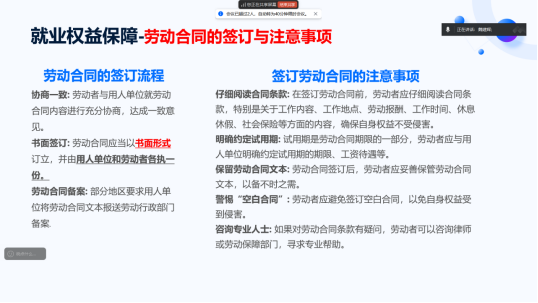 活动中,毕业班辅导员结合自身经历与就业指导经验,从劳动合同签订、劳动纠纷处理等方面,为同学们详细讲解了就业过程中常见的权益保障问题。针对毕业生普遍关心的劳动合同签订问题,辅导员重点讲解了劳动合同的必备条款、签订流程以及注意事项,并结合真实案例,提醒同学们警惕“空白合同”、“阴阳合同”等陷阱,学会用法律武器维护自身合法权益。