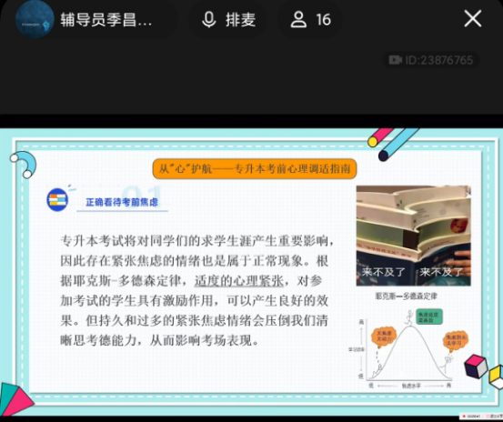 为助力2025届毕业生科学应对专升本考试压力,提升心理调适能力,3月23日晚,智能制造学院开展2025届毕业生“求职面对面”就业指导云服务活动(第六期)。